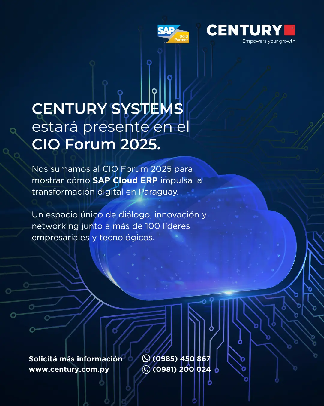 Nuestra participación en el CIO Forum 2025 refleja el compromiso de Century Systems y SAP con la innovación y la transformación digital en Paraguay. Este espacio será clave para mostrar cómo las soluciones Cloud de SAP permiten a las organizaciones adaptarse con mayor velocidad, mantenerse competitivas y crecer con confianza en un mercado cada vez más dinámico.