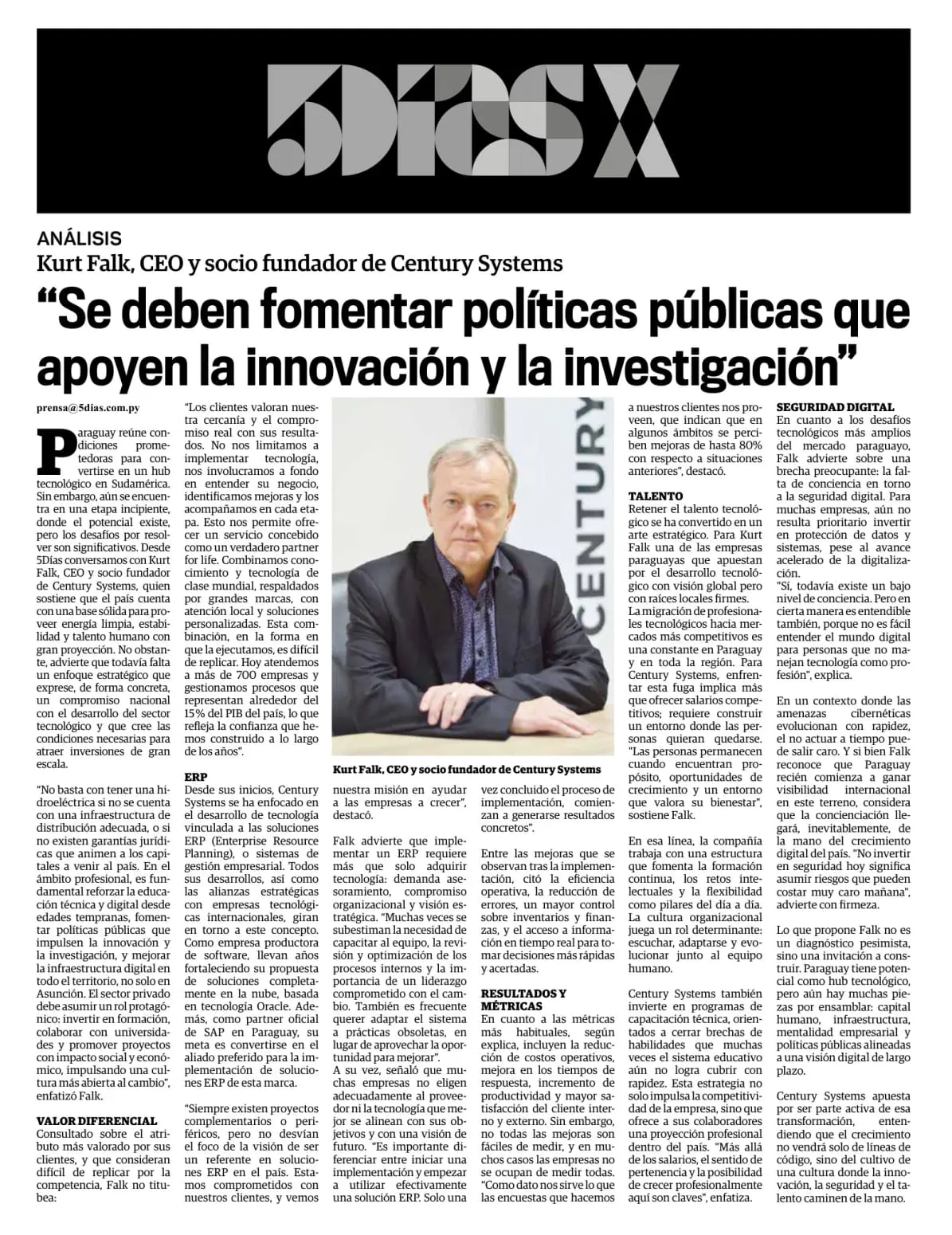 Paraguay reúne condiciones prometedoras para convertirse en un hub tecnológico en Sudamérica. Sin embargo, aún se encuentra en una etapa incipiente, donde el potencial existe, pero los desafíos por resolver son significativos. Desde 5Días conversamos con Kurt Falk, CEO y socio fundador de Century Systems, quien sostiene que el país cuenta con una base sólida para proveer energía limpia, estabilidad y talento humano de gran proyección. No obstante, el ajuste que todavía falta en un enfoque estratégico que, de forma concreta, asuma un compromiso nacional con el desarrollo de la tecnología y que cree las condiciones necesarias para atraer inversiones de gran escala.